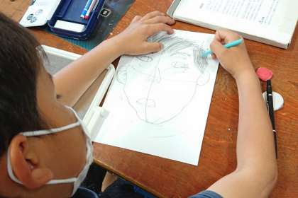 図工科の時間は、手鏡に写った自分の顔を見ながら似顔絵を描きました。