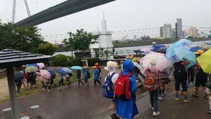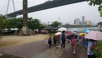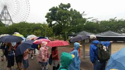 あいにくの雨ですが、日本一低い山の天保山4.73メートルにのぼりました。今から学校へ帰ります。USJが見えています。