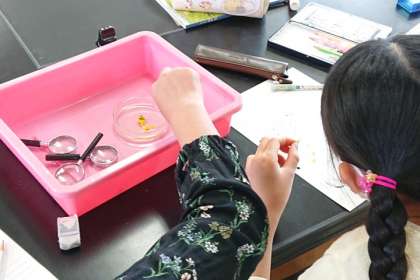 ピンセットでアブラナを分解して虫めがねを使って観察しています。