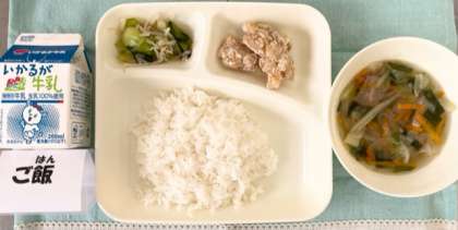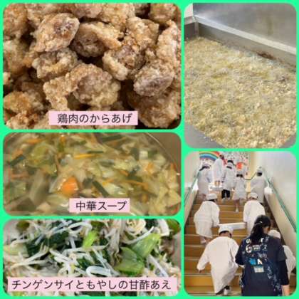 今日の献立は、鶏肉のからあげ・中華スープ・チンゲンサイともやしの甘酢あえ・ごはん・牛乳でした。