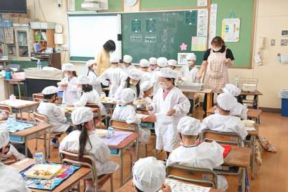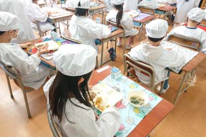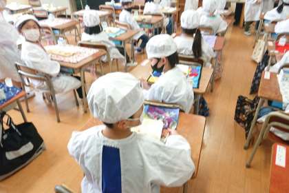 給食当番以外の子どもたちも、静かにすわって待っています。