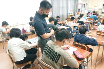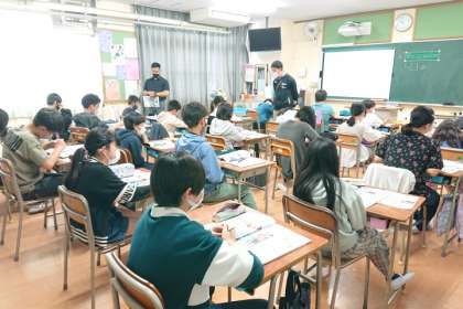 C−NET(ネイティブ)の先生が教室に入り、英語科の授業をしています。