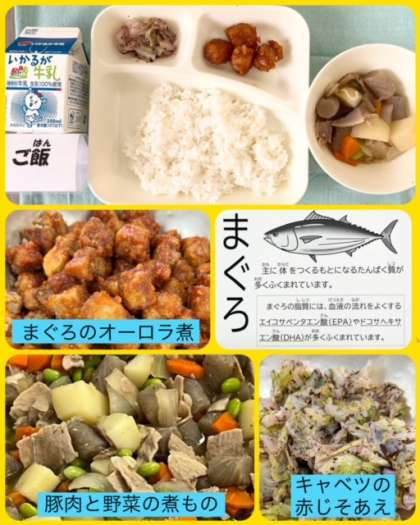 今日の献立は、まぐろのオーロラ煮・豚肉と野菜の煮もの・キャベツの赤じそあえ・ごはん・牛乳でした。