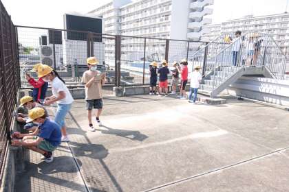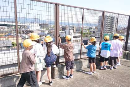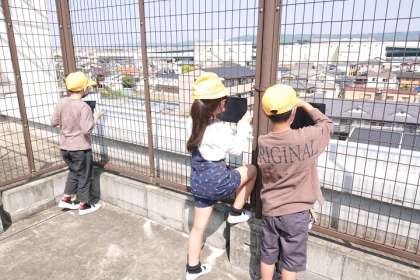 社会科の時間は、屋上に上がって学校のまわりのようすを見ました。