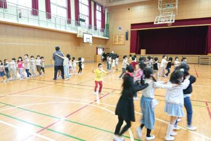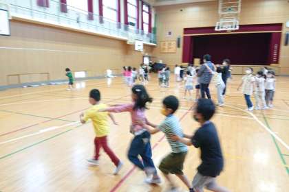 担任の話を聞いた後、最後に1・2年生みんなで「かもつれっしゃ」をして遊びました。