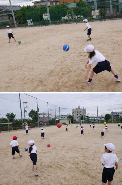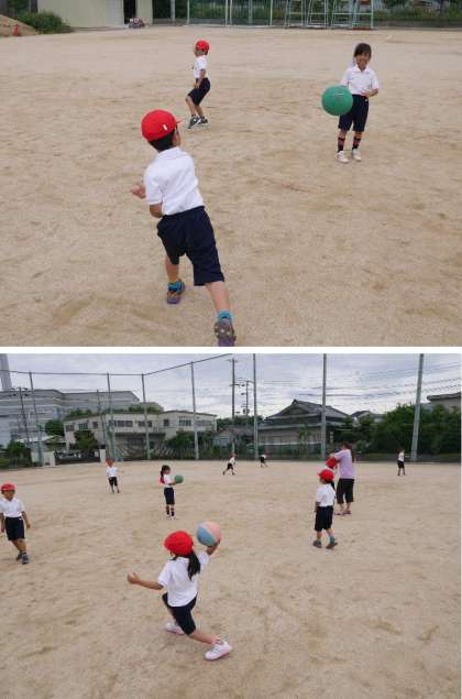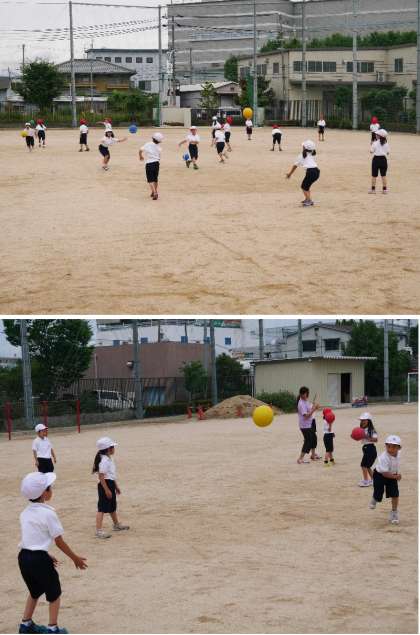 1年生の体育の授業でポールをなげています。片手でボールを肩の上から投げる練習です。なかなかむずかしいようです。両手で投げている子もいます。早く上手になってドッヂボールができるといいですね。