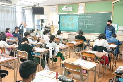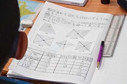 算数科の時間は、台形、平行四辺形、長方形、ひし形、正方形などの四角形が、線対称なのか点対称なのかみんなで話し合いながら調べました。