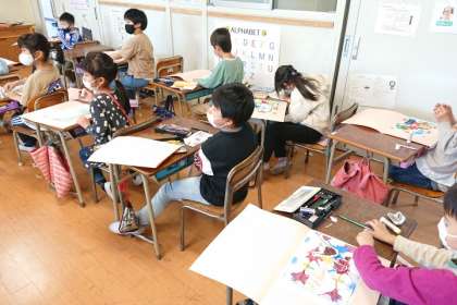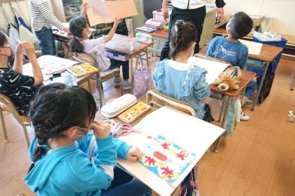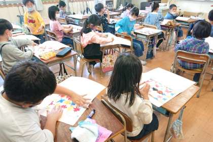 前の時間に、絵の具をつかって「おりぞめ」をしました。