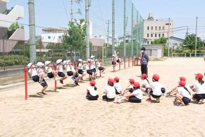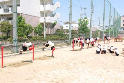 体育科の時間は、前回りや逆上がりがスムーズにできるようにするため、鉄棒にぶらさがって、あごが鉄棒のところにくるまで体を持ち上げたり、「ふとんほし」のポーズをしたりする練習をしました。