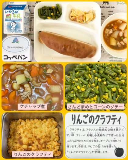 今日の献立は、ケチャップ煮・さんどまめとコーンのソテー・りんごのクラフティ・レーズンパン・牛乳でした。