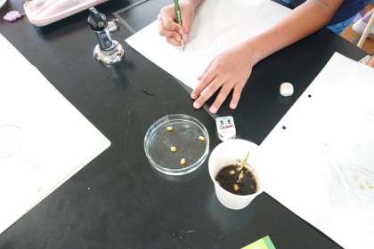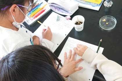 理科の時間は、種子が発芽するためには土が必要なのかどうか、実験でわかったことを記録しています。