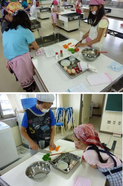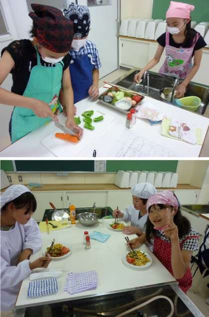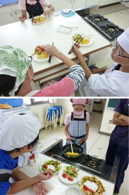 6年の家庭科調理実習では、「三色野菜いため」と「スクランブルエッグ」をつくりました。野菜の皮をむいたり、食べやすいように切ったりと基本的な調理方法を学習しました。おいしくいただきました。