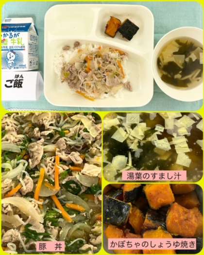 今日の献立は、豚丼・湯葉のすまし汁・かぼちゃのしょうゆ焼き・牛乳でした。