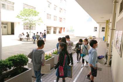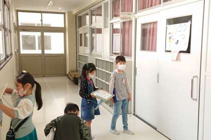 2年生が1年生をやさしくリードして、なかよく学校たんけんをすることができました。