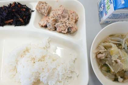 今日の献立は、ごはん、さけのごまみそ焼き、五目汁、ひじきのいため煮、牛乳です。