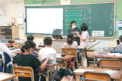 など、英語の表現を使って、2人組で自分を紹介しあうやりとりをしました。