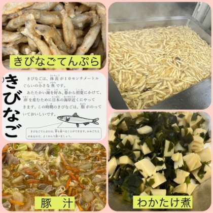 今日の献立は、きびなごてんぷら・豚汁・わかたけ煮・ごはん・牛乳でした。