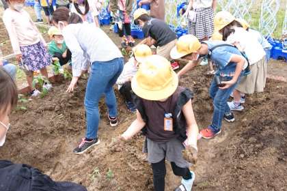 生活科の時間は、学習園にさつまいもの苗を植えました。