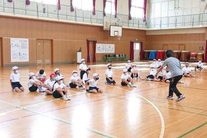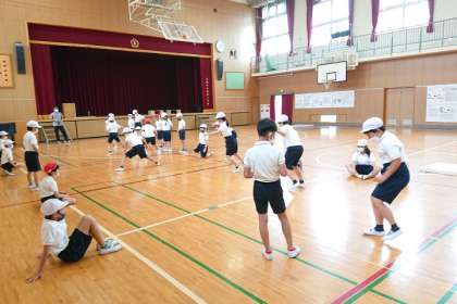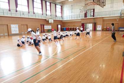 体育科の時間に、体力テストの「反復横とび」の練習をしています。