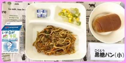 焼きそばやスパゲッティの日には、いつもの半分の大きさの黒糖パンがつきます。
