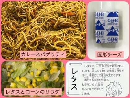 今日の献立は、カレースパゲッティ・レタスとコーンのサラダ・固形チーズ・黒糖パン(1/2)・牛乳でした。