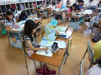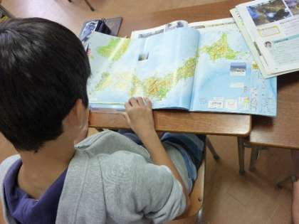 4年生が地図帳をみて、日本の場所を学習しています。