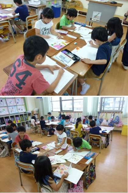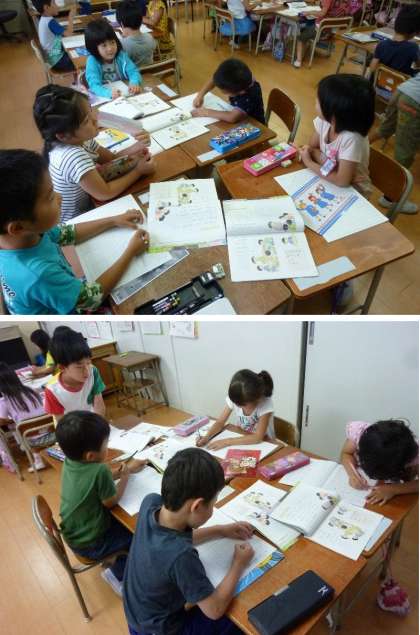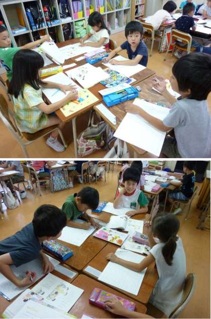 1年生が班に分かれて座っています。先生が班の一人にだいじなことを伝えます。先生から聞いたことを班みんなに上手につたえます。あしたの持ち物や時間割を聞いて覚えてしっかり伝えられるかな。とても大切なお勉強ですね。