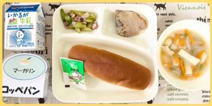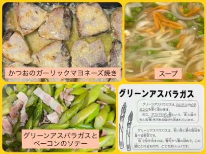 今日の献立は、かつおのガーリックマヨネーズ焼き・スープ・グリーンアスパラガスとベーコンのソテー・コッペパン・マーガリン・牛乳でした。