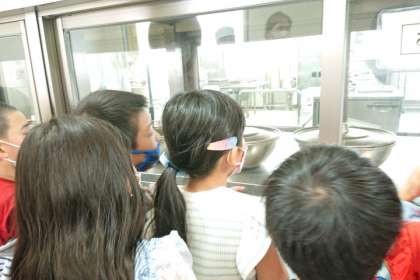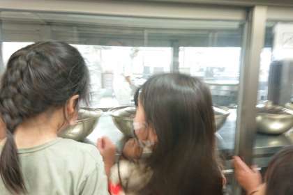 大きな鍋で給食を作っているようすを見て、子どもたちは驚いていました。