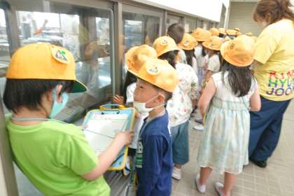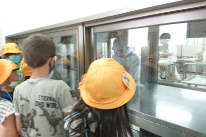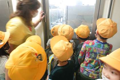 生活科の時間は、みんなで給食室をのぞき、給食調理員さんの仕事のようすを見学しました。