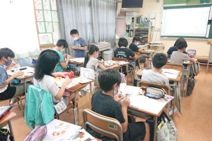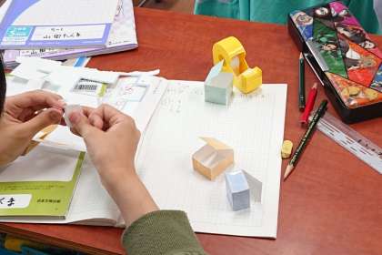 算数科の時間は、厚紙で3つの立方体や直方体を作り、その中でいちばんかさが大きいのはどれか考えました。