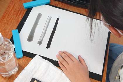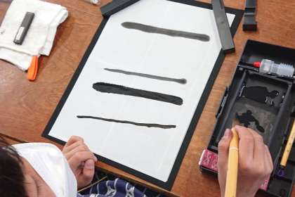 すずりで墨をすったり、筆を持って横の線を書いたりしました。
