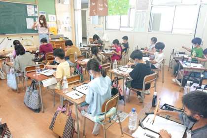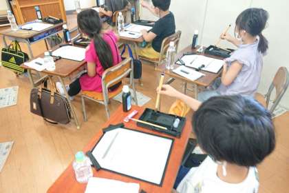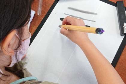 すずりで墨をすったり、筆を持って横の線を書いたりしました。