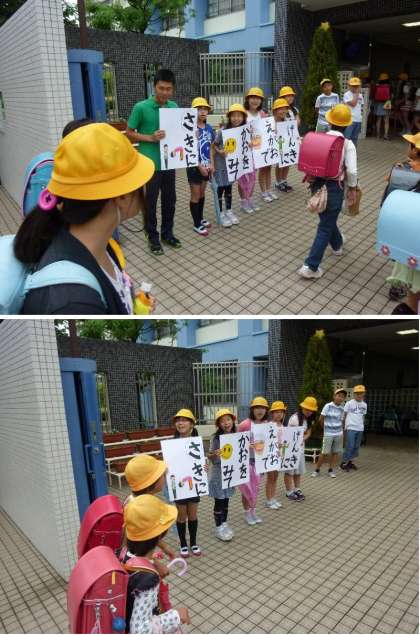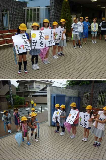 先に、顔を見て、笑顔で、元気に!児童会あいさつ運動