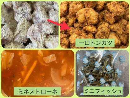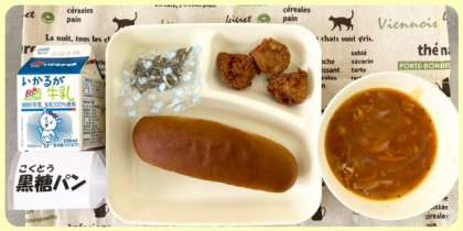 今日の献立は、一口トンカツ・ミネストローネ・ミニフィッシュ・黒糖パン・牛乳でした。