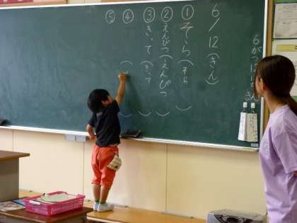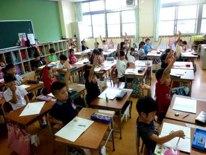 1年生の国語の授業です。前で答えようと皆がんばって手をあげています。すばらしいですね。