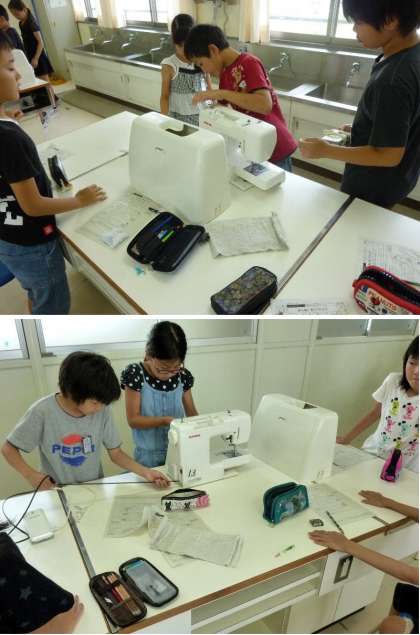 5年の家庭科でミシンの学習です。初めての操作にとまどいながら、今日は安全にからぬいをれ集していました。