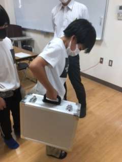 そして、最後に1億円の重さも体験しました。とても重たくて、びっくりしていました。