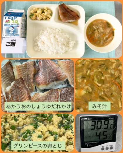 今日の献立は、あかうおのしょうゆだれかけ・みそ汁・グリンピースの卵とじ・ごはん・牛乳でした。