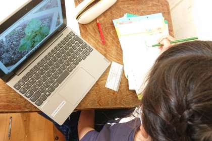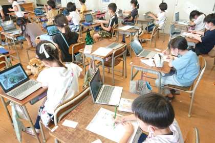 生活科の時間は、1人1台PCでミニトマトの写真を撮って、教室でカードに記録しました。