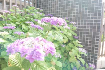 学校の玄関のあじさいがきれいに咲いています。