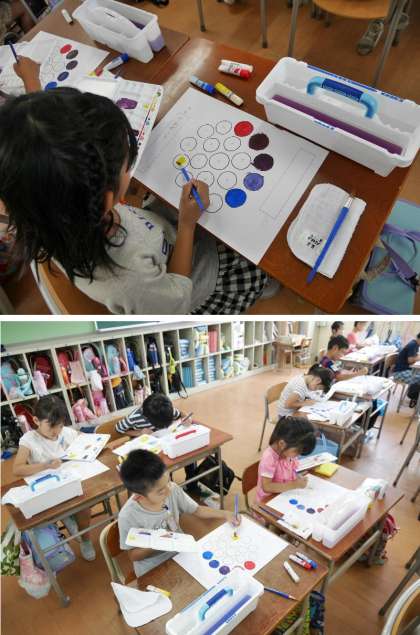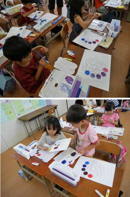 2年生が絵具をつかって、いろいろな色を作っています。クレパスとちがって、色を混ぜると違う色を作ることができますね。好きな色を自由につくれるようになると、いろいろな作品を作ることができるね。