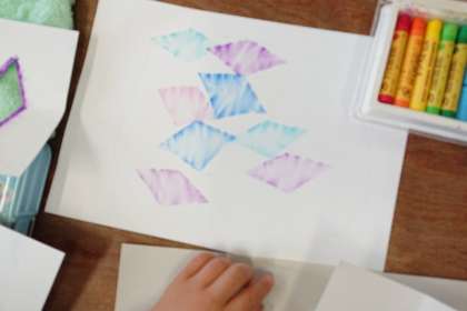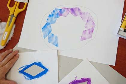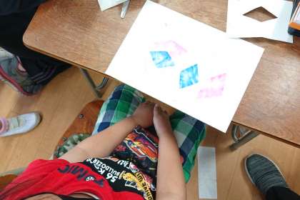 図画工作科の時間は、切り抜いた穴から画用紙にパスを塗り、指でこすって模様を描きました。
