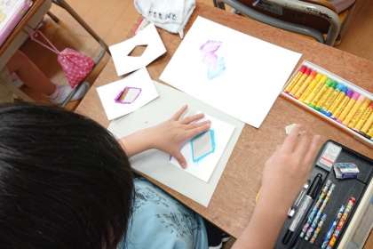 図画工作科の時間は、切り抜いた穴から画用紙にパスを塗り、指でこすって模様を描きました。