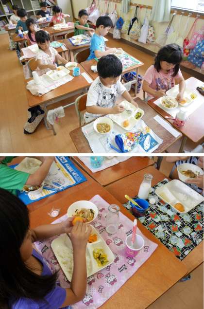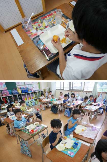 給食に「ビワ」がでた。初めて食べる1年生がおいしく食べた
