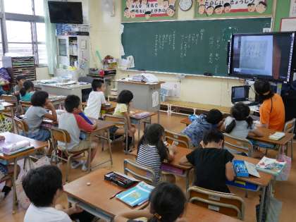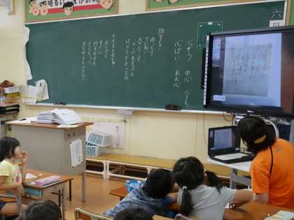2年生の国語では、「大事なことをおとさずに聞く」ことを学習しています。そのためには、メモをとって聞くことができるようになるといいですね。皆のメモを電子黒板でみながら学習をすすめています。