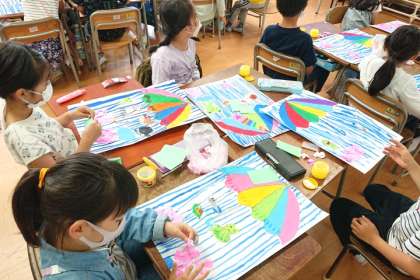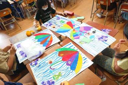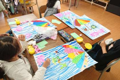 図画工作科の時間は、「たのしい雨の日」をテーマに作品を描いています。