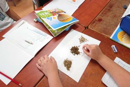 理科の時間は、じゃり、砂場の土、運動場の土のちがいを観察しました。