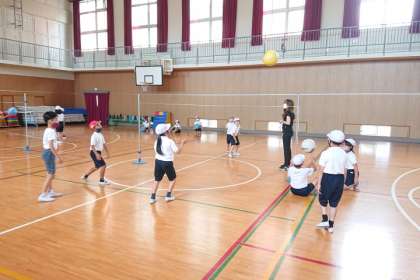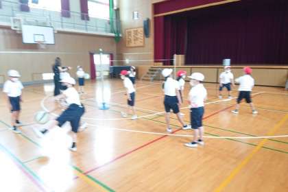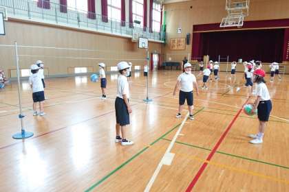 体育科の時間は、グループでソフトバレーボールの練習をしました。