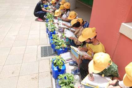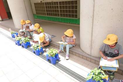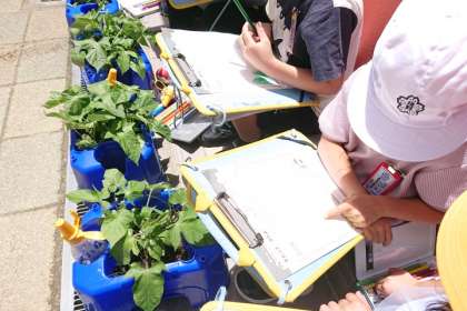 生活科の時間は、一人一人が育てているあさがおを観察し、カードに絵をかいて記録しました。